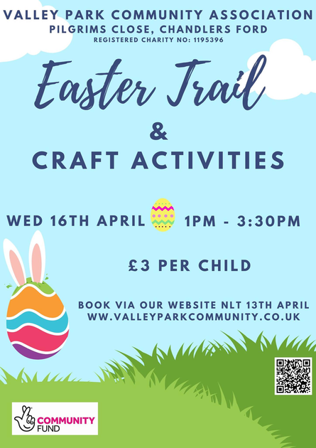 Booking is essential. Arrive at the Community Centre at any point during the session, just make sure that you leave enough time for the activities. You decide what order to do everything in; you may choose to enjoy a cup of tea and piece of cake from our Community Kettle before braving the trail or starting the Easter craft activity.