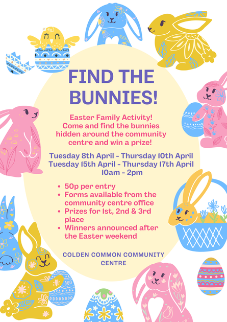 FIND THE BUNNIES! Come and find the bunnies hidden around the Community Centre and win a prize!