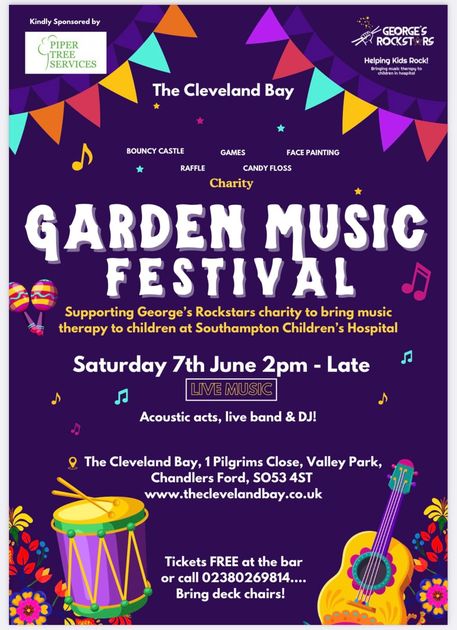 The Cleveland Bay is hosting the Garden Music Festival, a charity event supporting George's Rockstars to bring music therapy to children at Southampton Children’s Hospital. There will be acoustic acts, live bands, a DJ, bouncy castle, games, face painting, raffle, and candy floss. Entry is free, and attendees are encouraged to bring deck chairs. Tickets can be collected at the bar or by calling 02380269814.