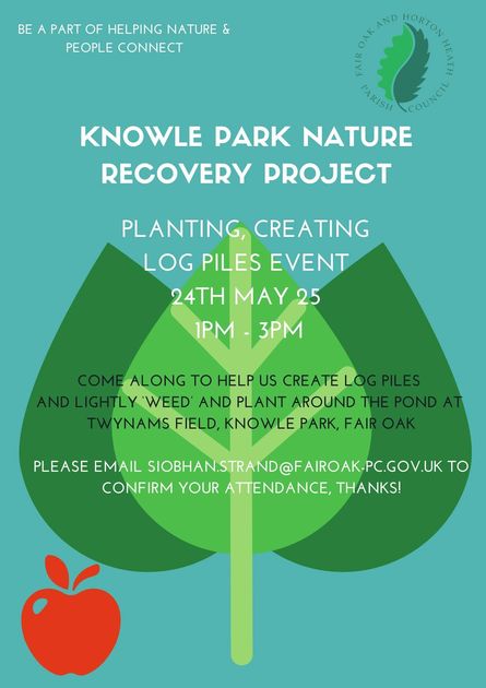 Join the Knowle Park Nature Recovery Project for a planting and creating log piles event. Participants can help create log piles and lightly weed and plant around the pond. The event takes place at Twynams Field, Knowle Park in Fair Oak. Please email Siobhan at FAIR OAK Parish Council to confirm attendance.
