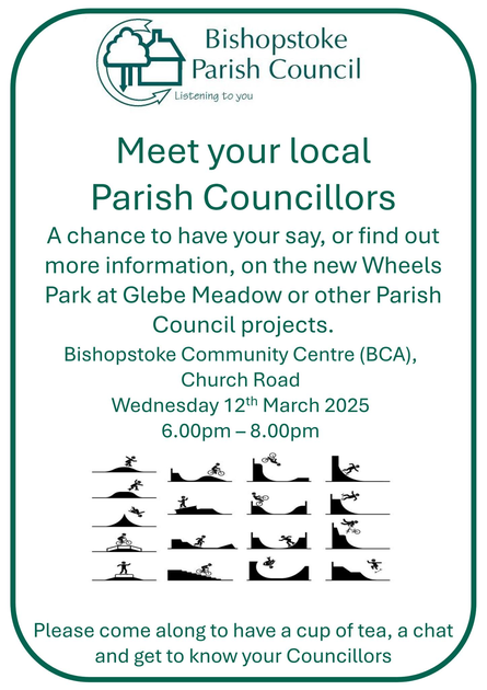 Our next Meet your Parish Councillors session will be tomorrow, 12th March, from 6.00pm-8.00pm at the BCA on Church Road. This will also be your chance to let us know your thoughts and ideas for the new Wheels Park at Glebe Meadow or about anything else happening in Bishopstoke. We look forward to seeing you there.