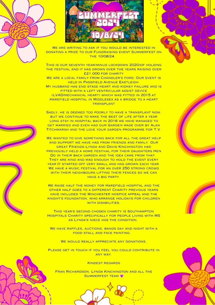 WE ARE WRITING TO ASK IF YOU WOULD BE INTERESTED IN DONATING A PRIZE TO OUR FUNDRAISING EVENT SUMMERFEST ON